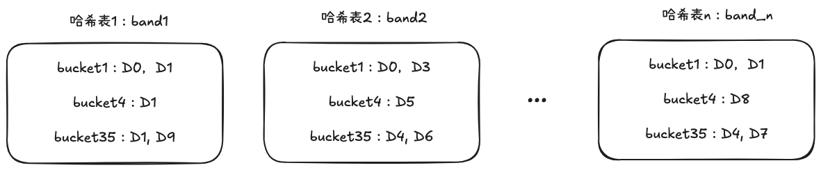 - 重复构建:对 n 个 band 分别构建 n 张哈希表(不同位置的 band 不可比较)