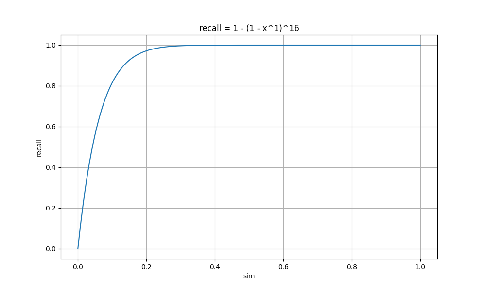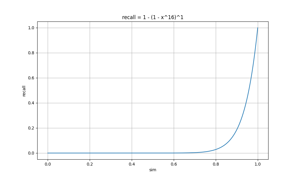 也就是说,LSH 算法在参数 r, n 下的召回率为: \[ recall = 1 - (1-sim^r)^n, \ sim\in [0,1] \] 以 k = 16,画出不同 r 值的 recall 曲线: