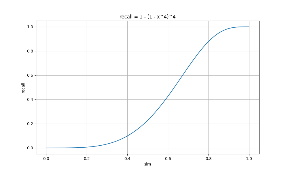 说明对于相似度 sim 的两个文档,通过 LSH 计算,有 1 - (1-simr)n 的概率会被分到一个桶内(在一个桶内就会被搜索,即召回)